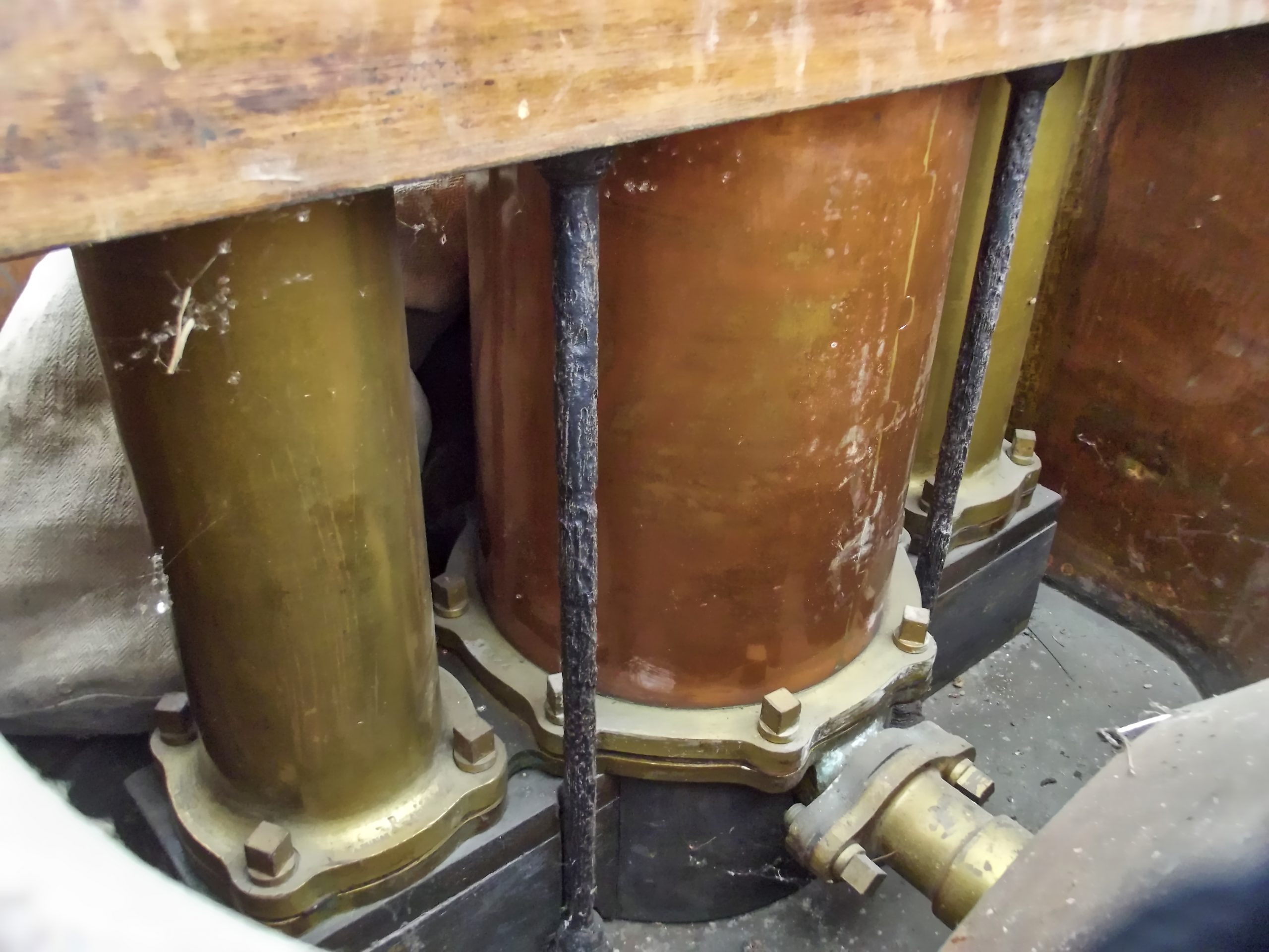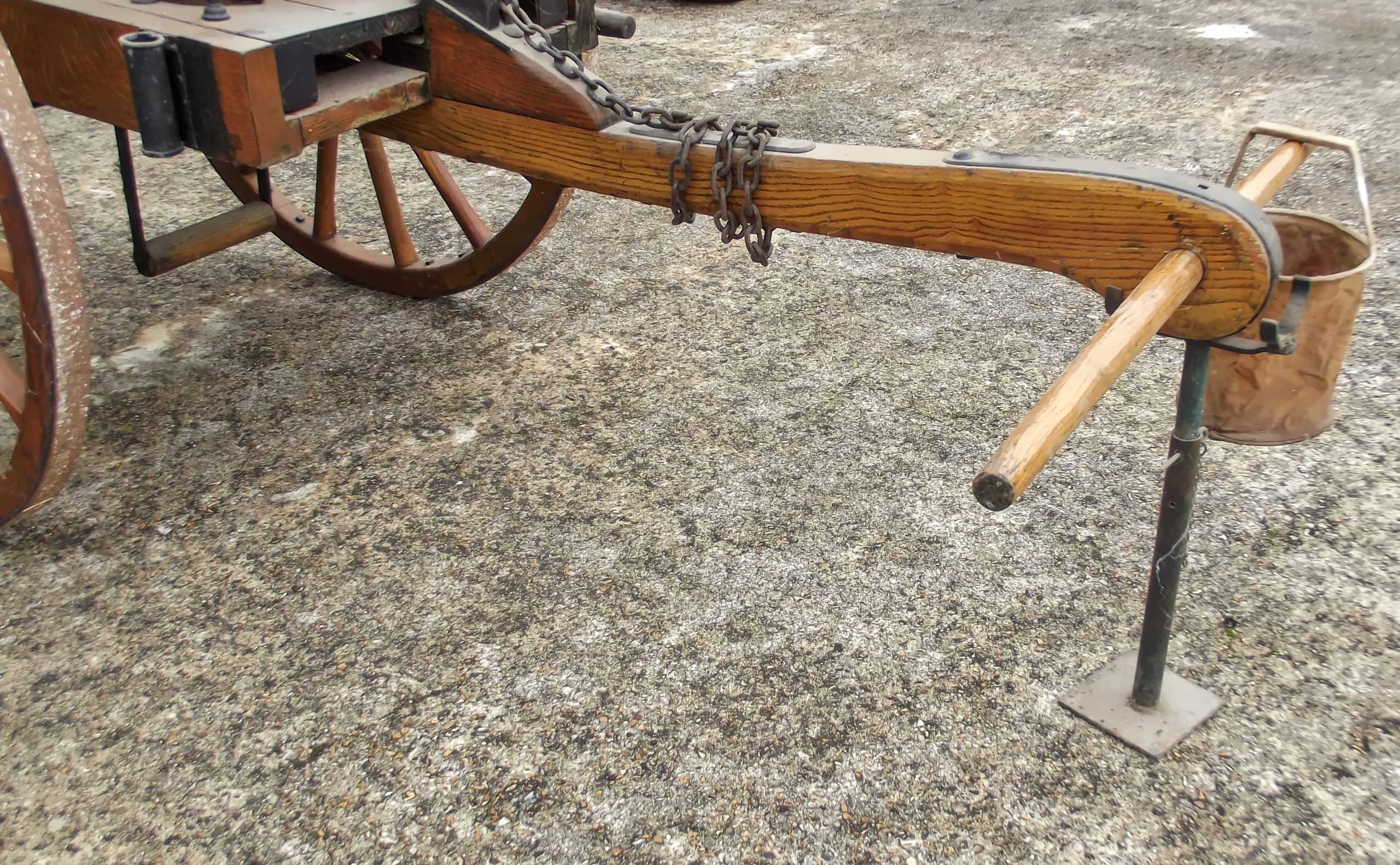 Cette pompe bâtie en bois fonctionne grâce à un tuyau aspirant et refoulant et une cuve en cuivre.